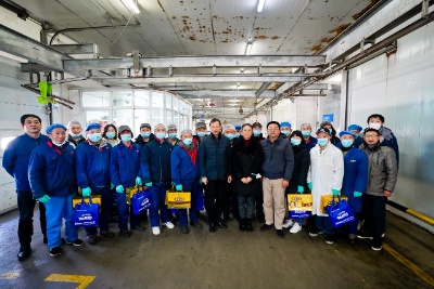 徐美华一行来到爱森加工厂储运部冷库向奋战在一线上的员工送上慰问品,感谢他们顶着寒潮坚守一线,全力以赴保障市民餐桌假日期间的正常供应,并为他们送上新年寄语,祝愿在新的一年事事如意、工作顺利。